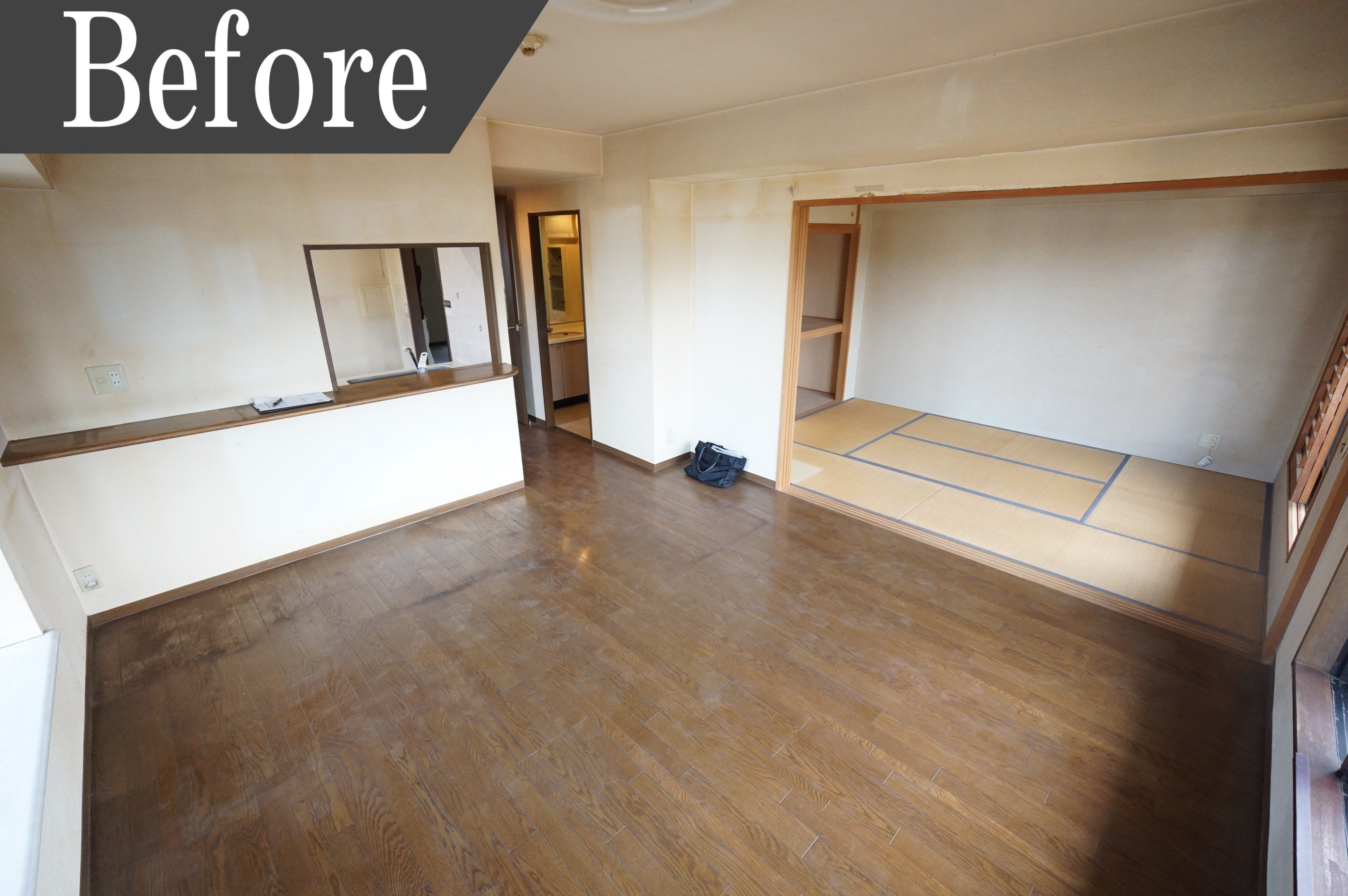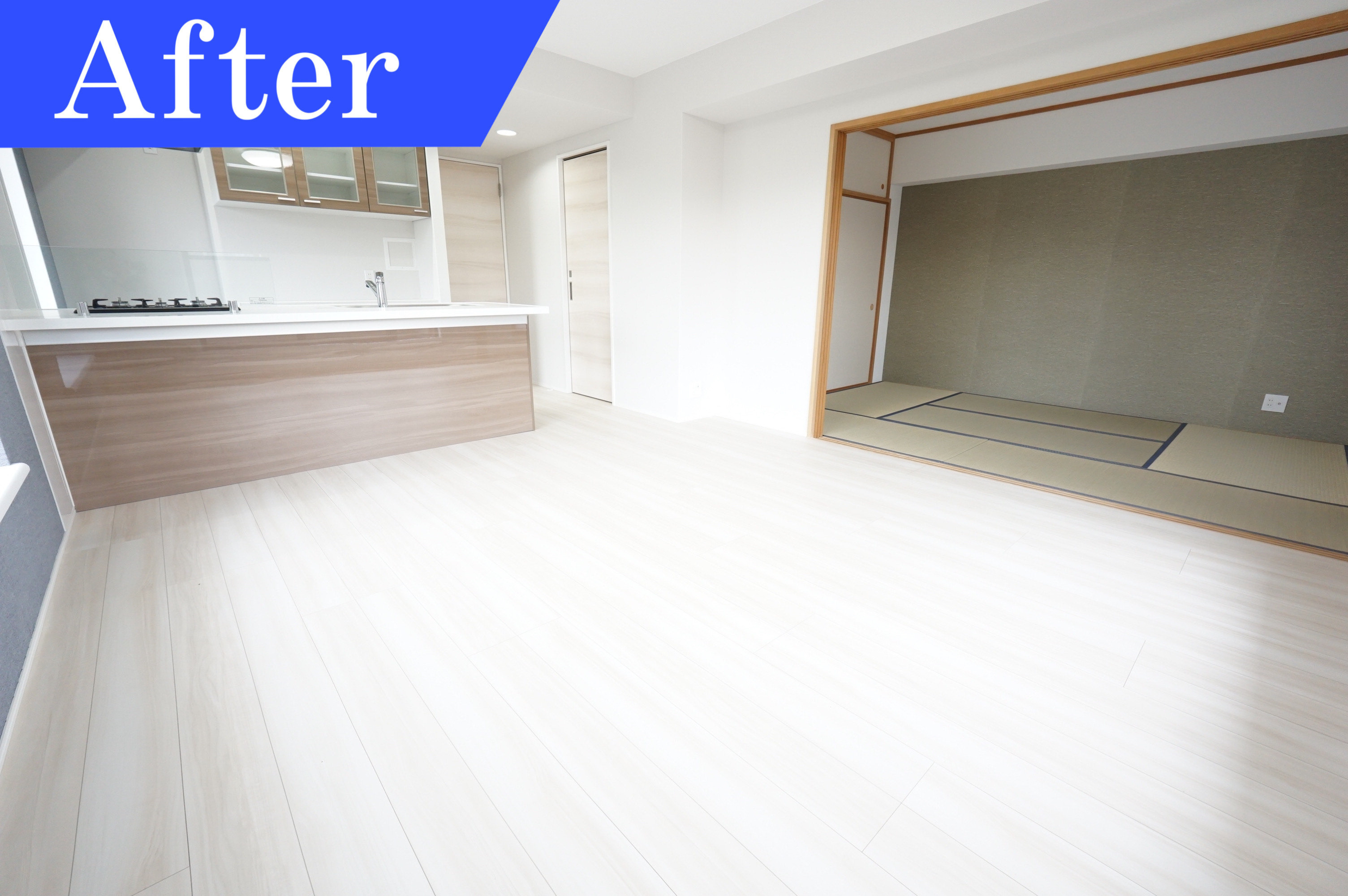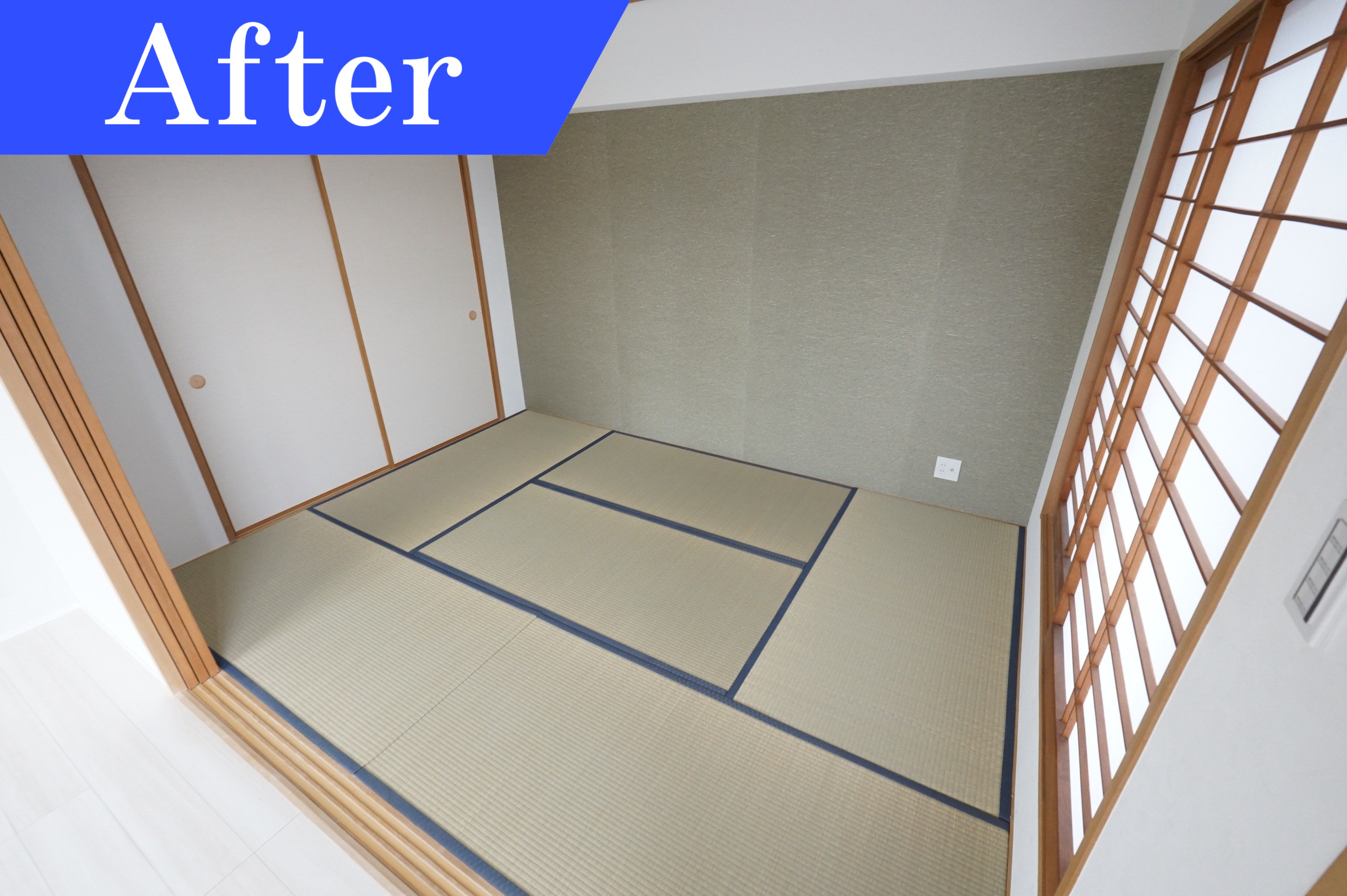 リビング横に隣接する和室は、畳が傷み、壁も黄ばみと汚れがあったため、畳、壁紙共に張り替えました。綺麗でまだ使える和室の障子の枠は障子を張替え使用し、襖も張替えて使用。リビングと色合いを合わせ、一面壁には緑色を使用し、和室の引き戸を開放していても空間全体に繋がりがあるようにしています。和室が綺麗になった事でい草の落ち着くいい香りがして癒されそうです。