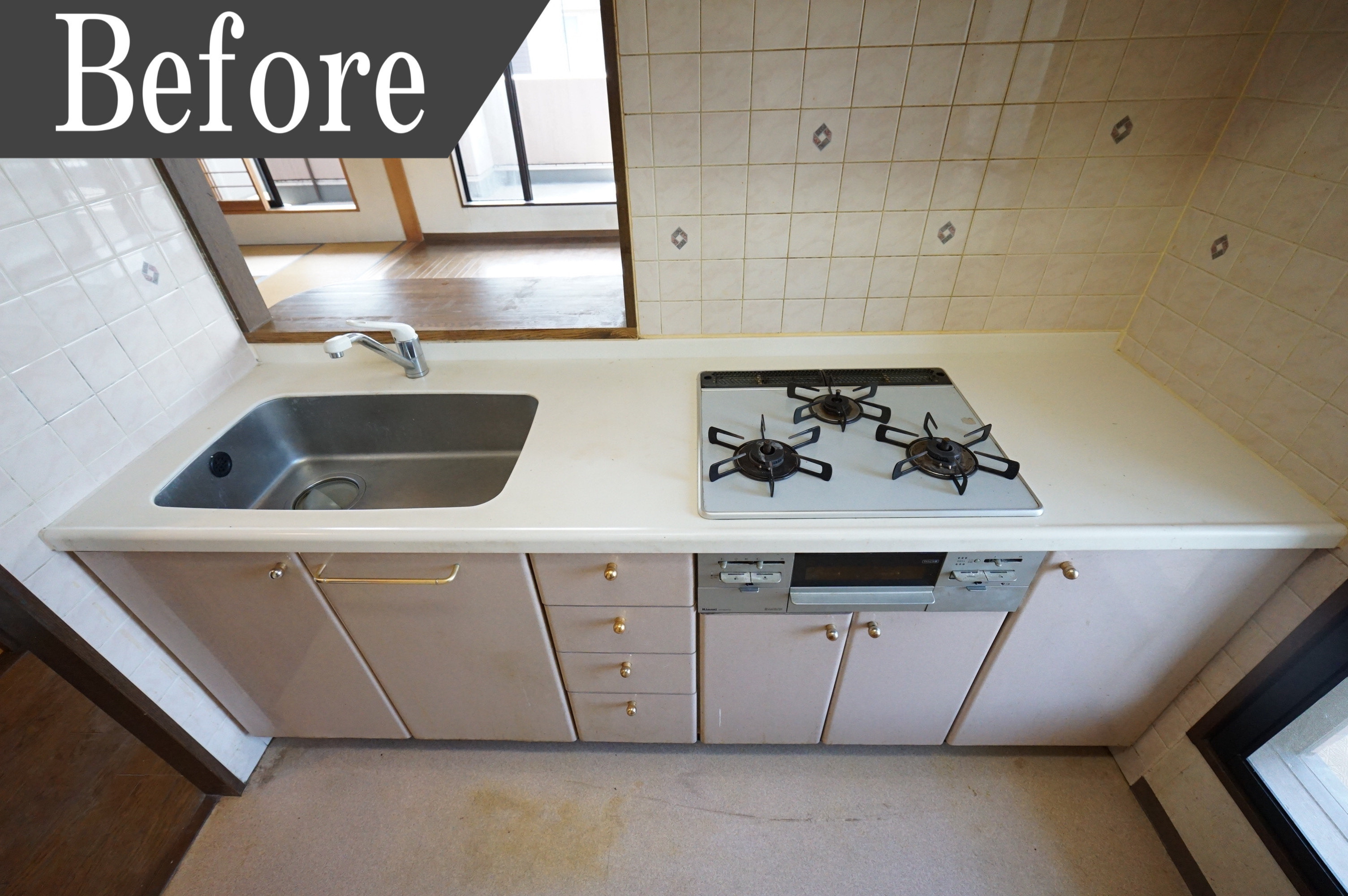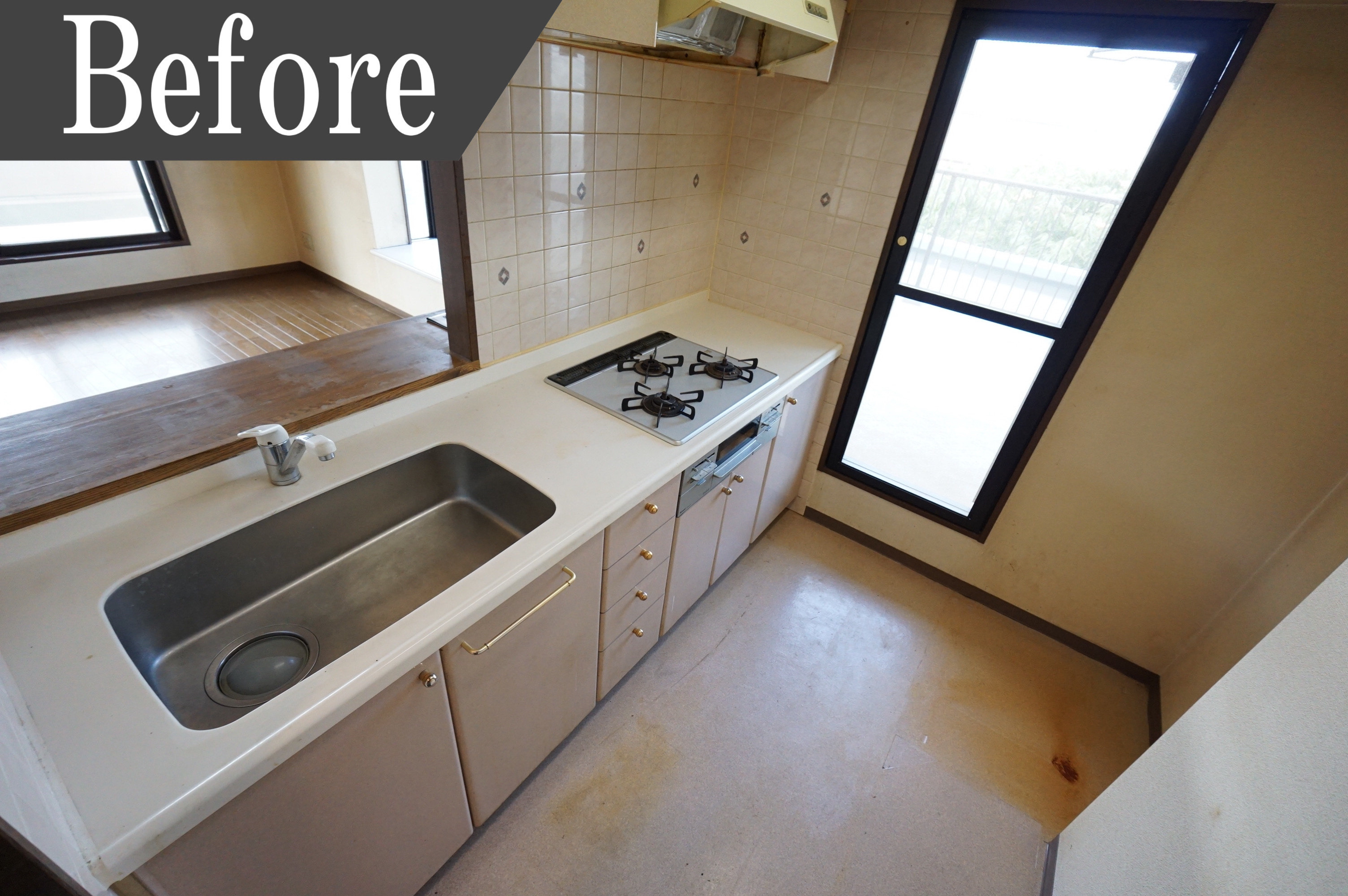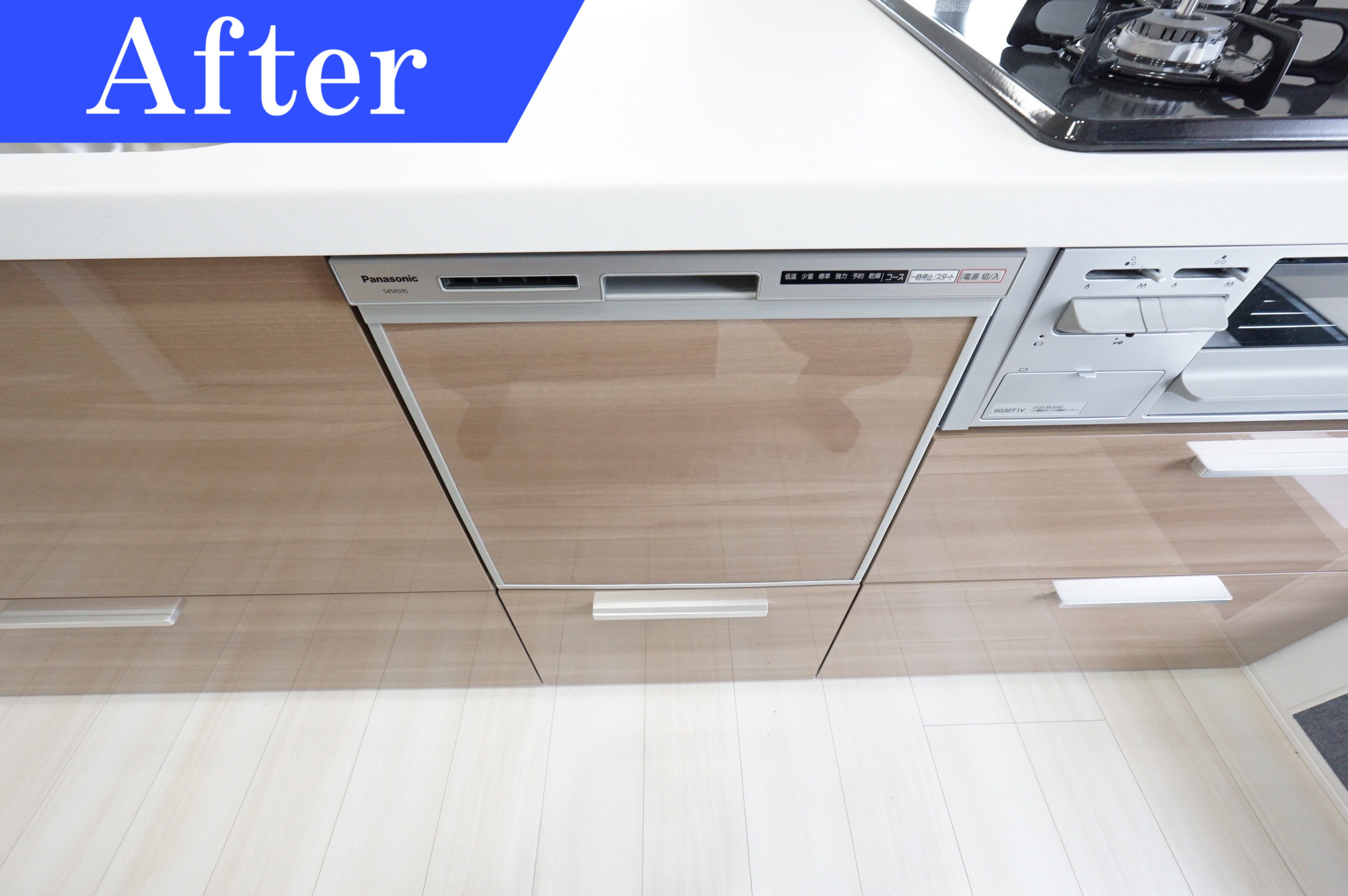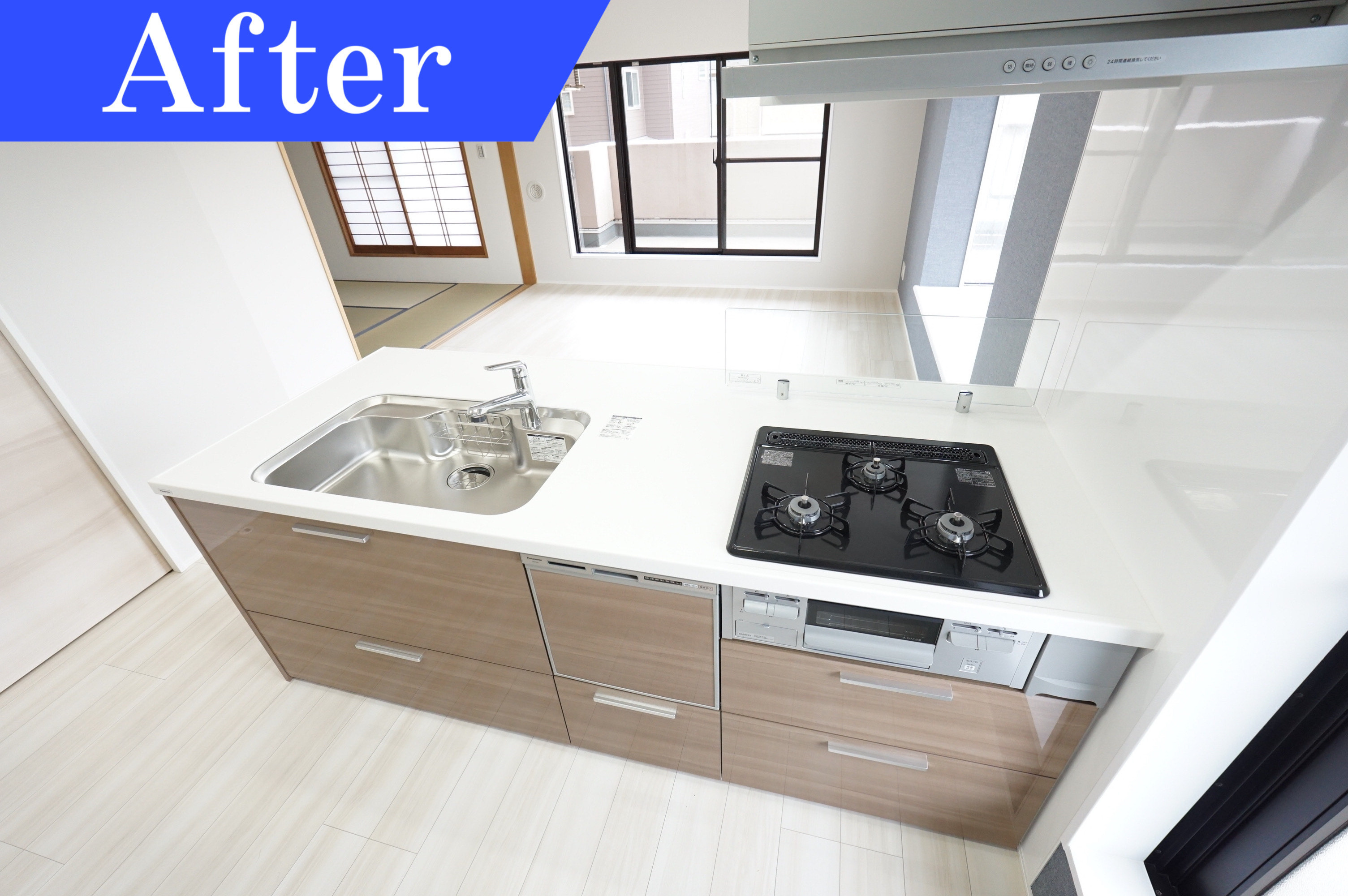 油汚れが目立つキッチンは、キッチンとリビングを繋ぐ壁を取り除いた事でリビングとキッチンに広がりがうまれ開放的な雰囲気になりました。対面式のキッチンでお料理をしながら家族とコミュニケーションが取れるので家族との会話が増えます。お料理の配膳もスムーズです。また最新式のシステムキッチンを採用したことで収納も豊富。食器洗浄乾燥機付きで家事効率UPに繋がります。
