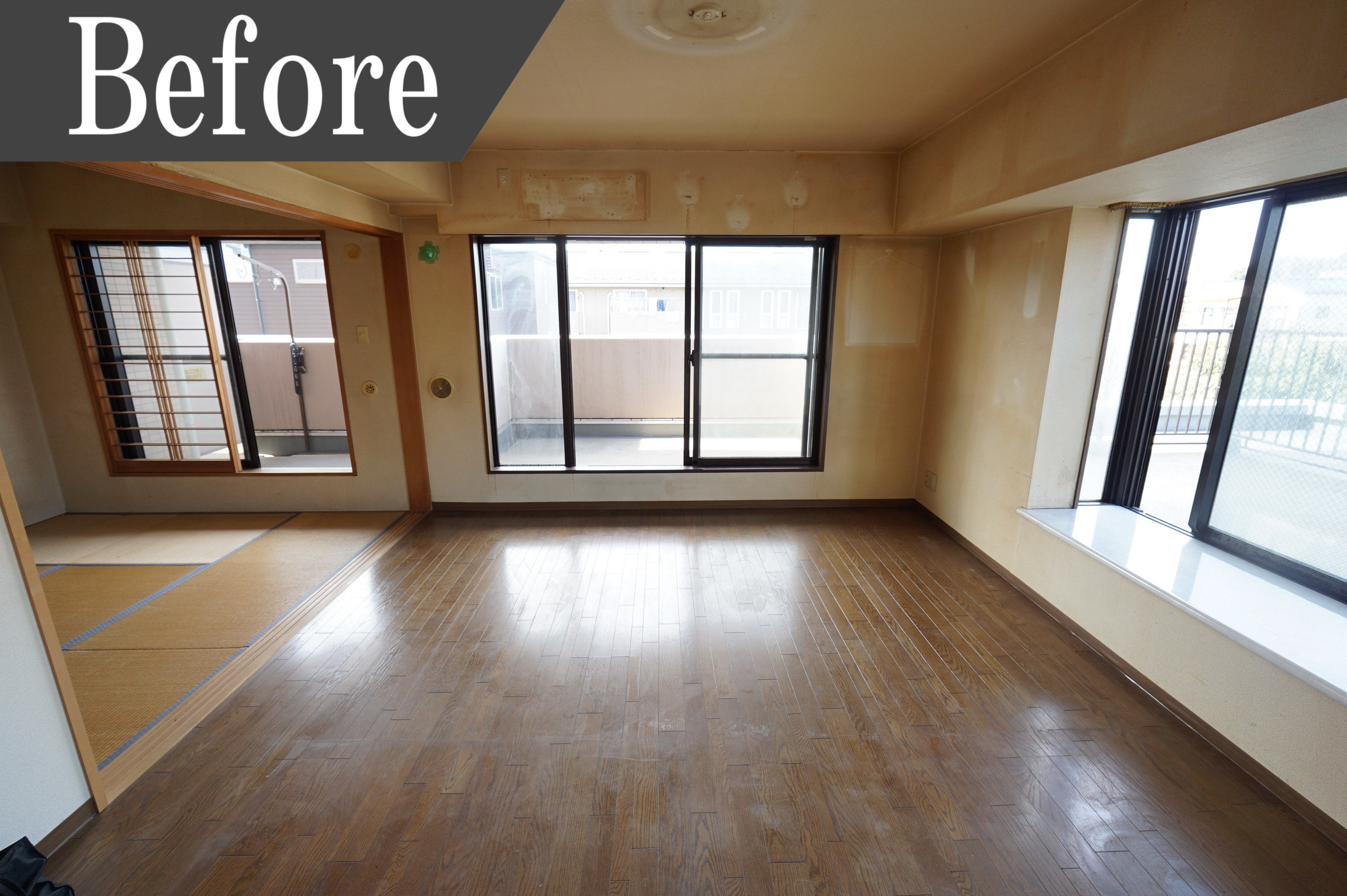 二面採光で明るく開放的なリビング空間は、壁の汚れと建具の汚れが気になります。リビング全体が採光が入るにも関わらず暗いイメージ。そんなリビングダイニングは、床にホワイトカラーの木目を使用し、壁紙も張り替えました。一面にはグレーのデザイン壁を使用し、オシャレ感もUP。明るく開放的で家族が集い寛ぐことのできるリビング空間になりました。