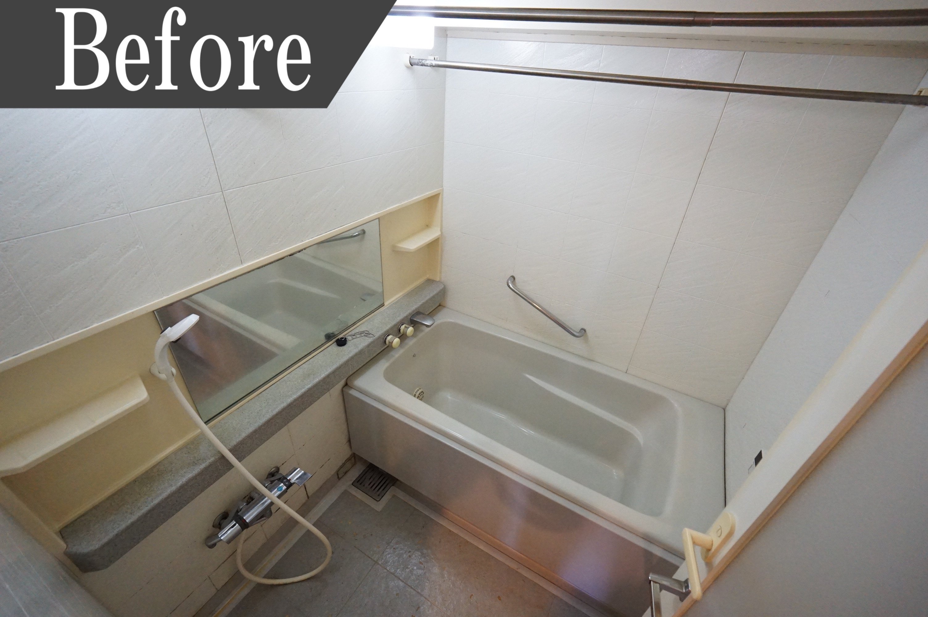 浴槽は深く、出入りがしにくい昔のデザインだったため最新の浴槽に交換。浴室から立ち上がる時に手助けとなる手すりもついています。浴槽の蓋もお手入れのしやすいタイプです。