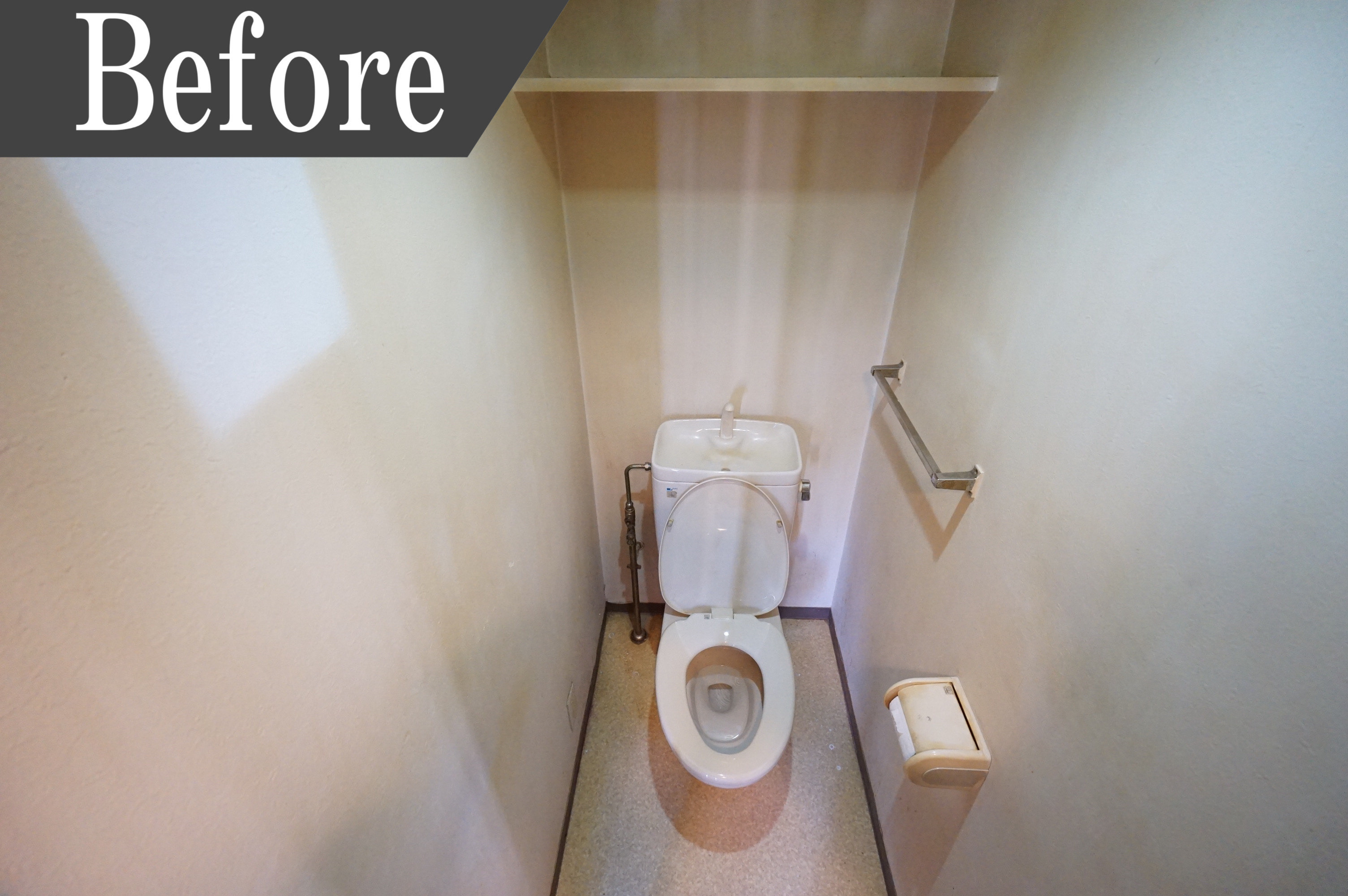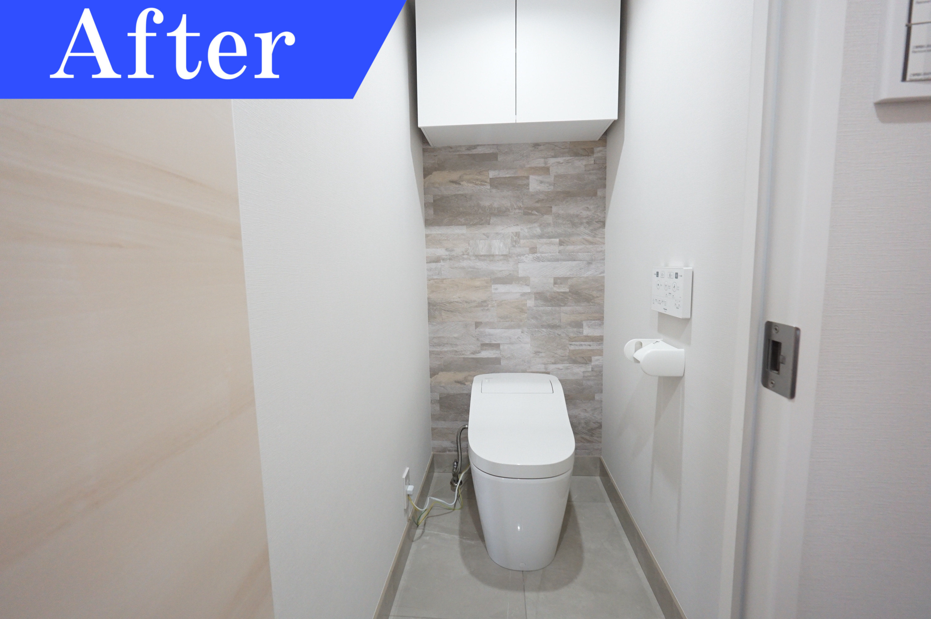 白で統一されていたトイレは、月日とともに黄ばみ、使用感あるトイレとなっていました。そのため総取り換え。便座は最新型のタンクレスタイプでウォシュレット機能付き。すっきりとしたデザインが特徴。