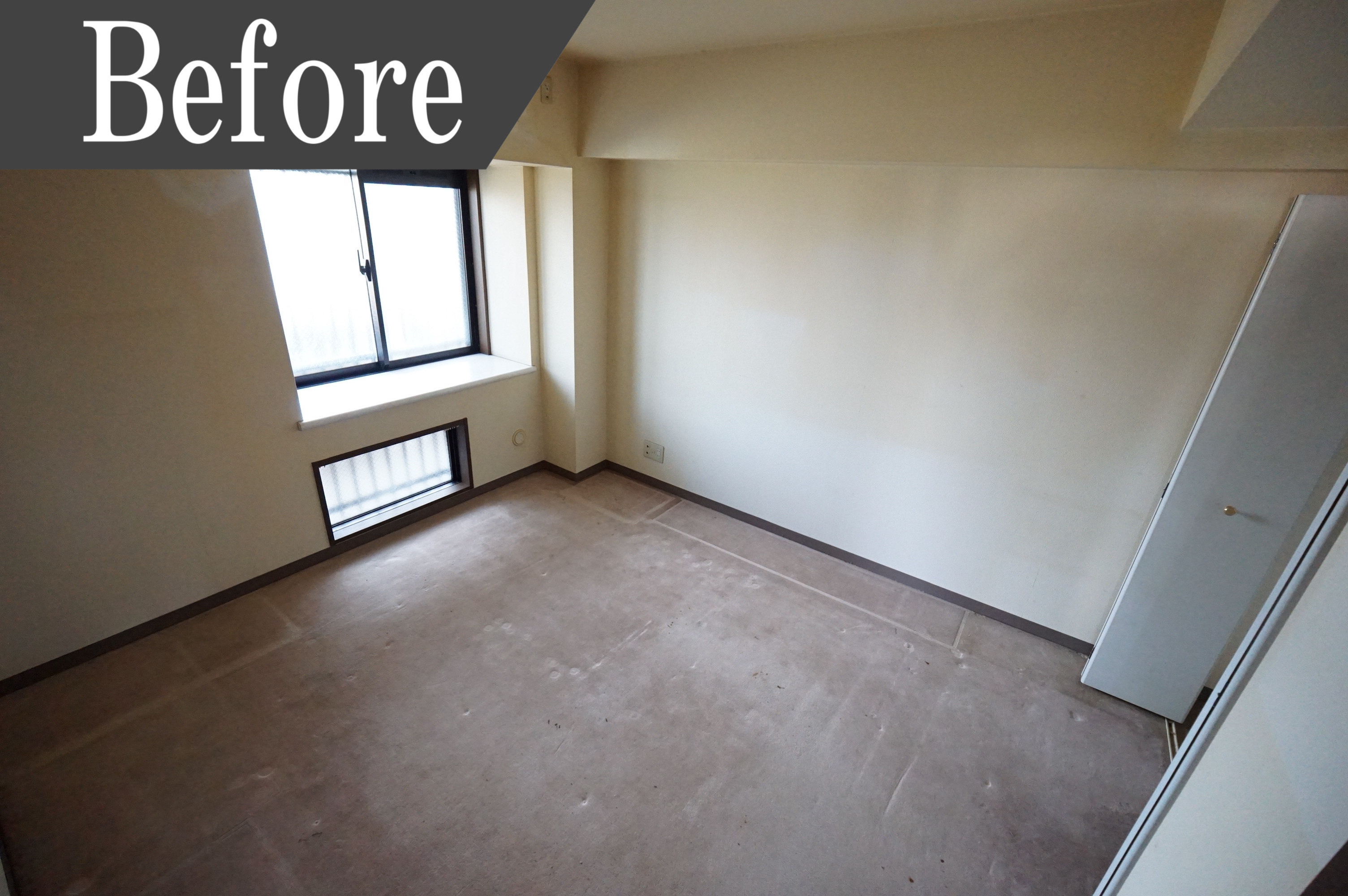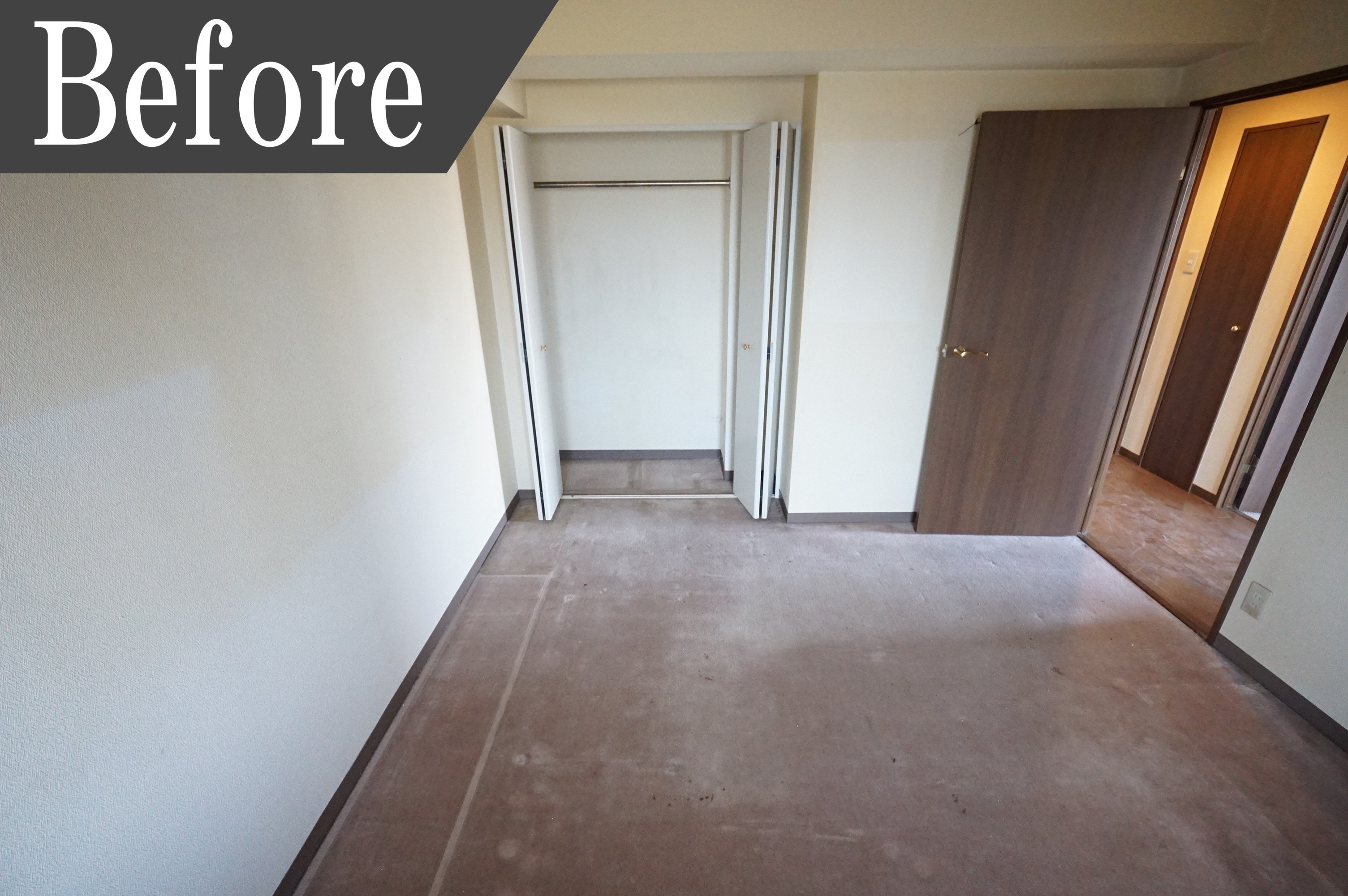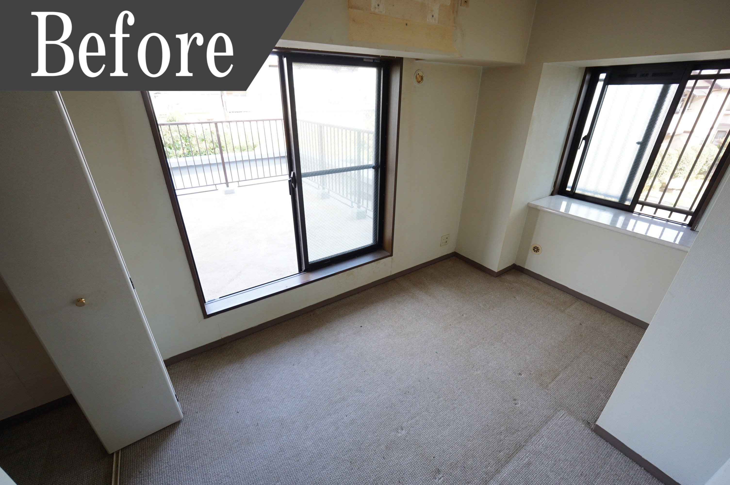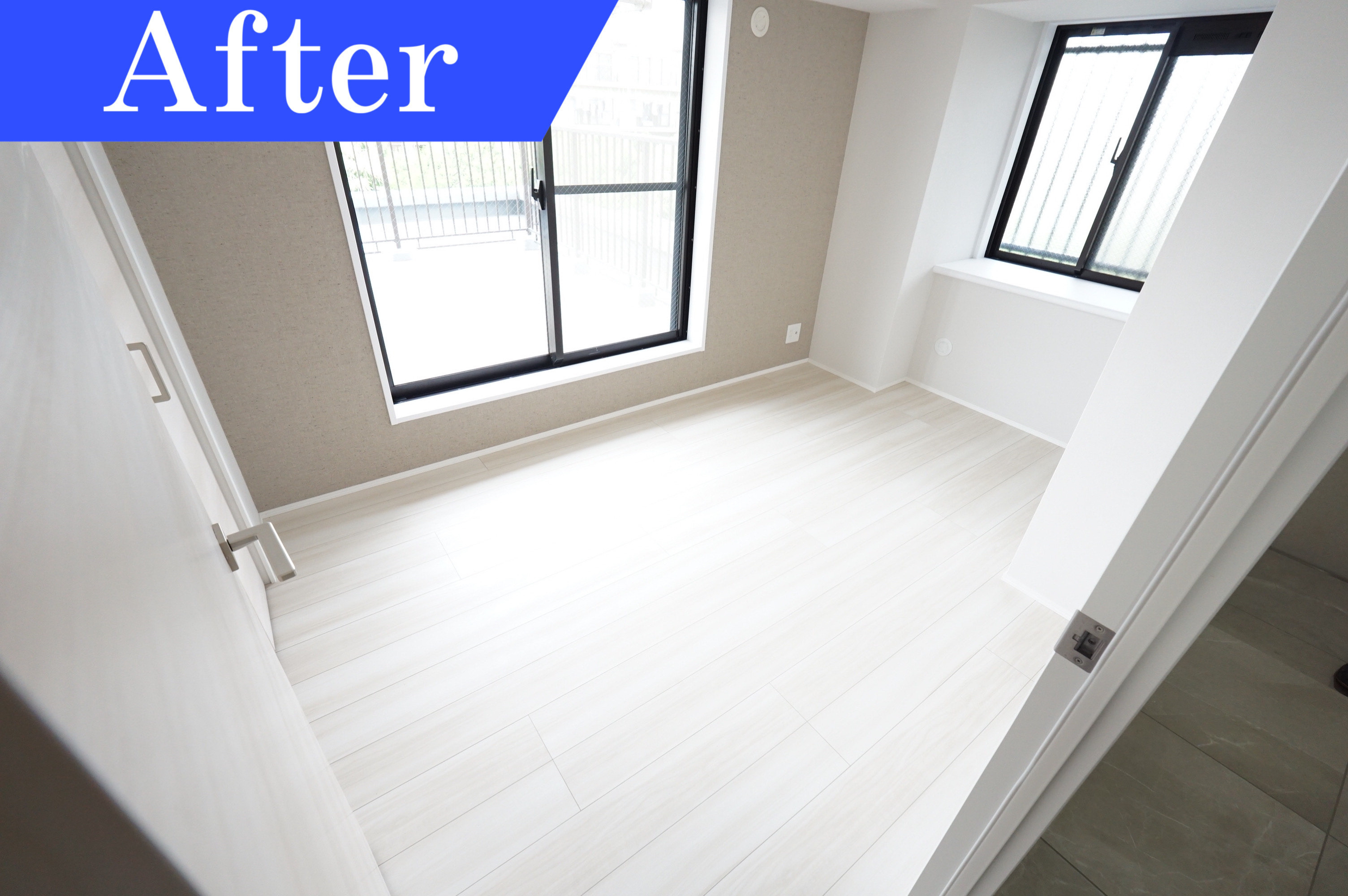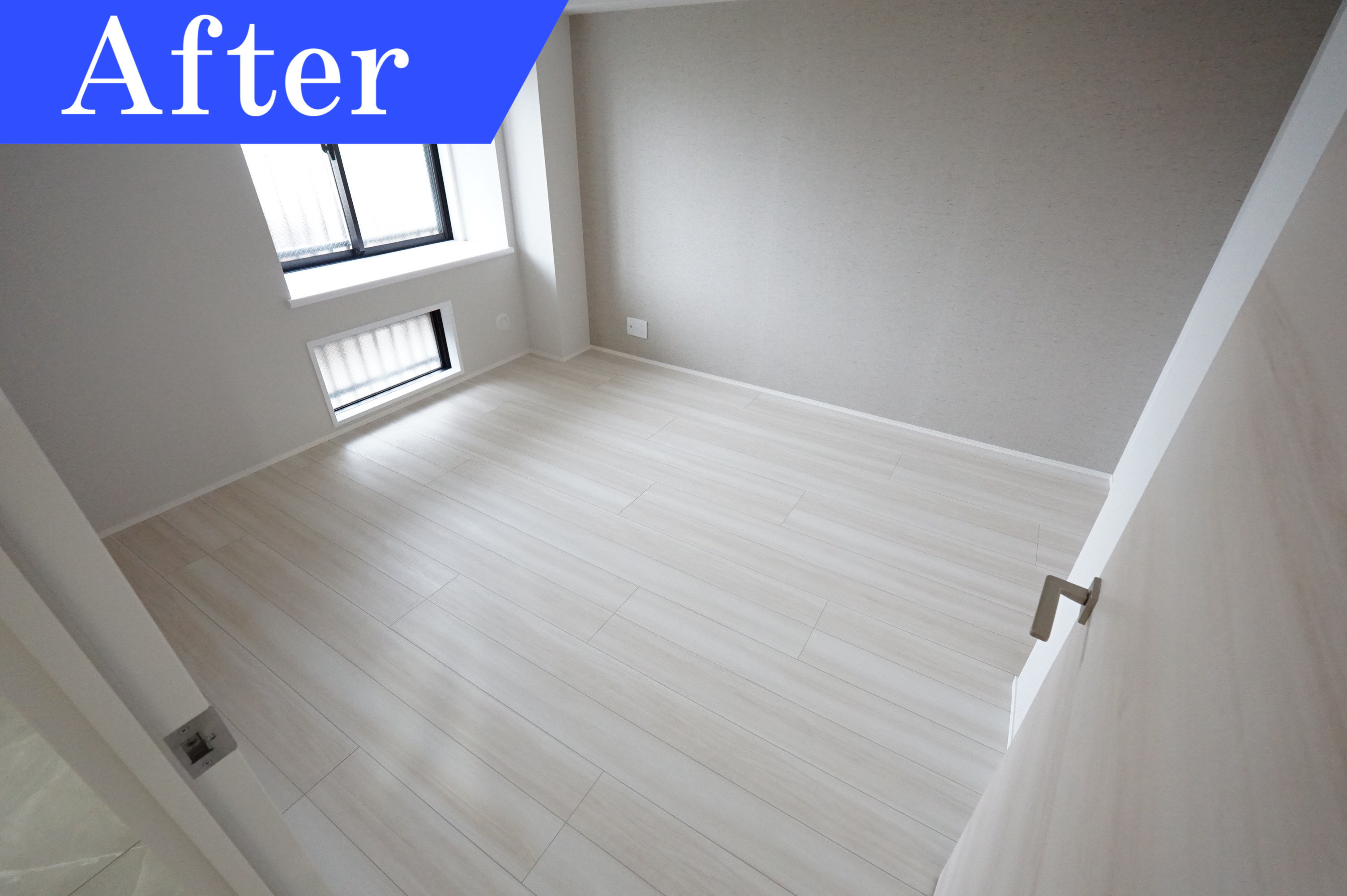 明るい陽射しが入り込む各洋室はカーペットは汚れ、壁も生活感が隠し切れません。そのため建具の交換、壁と床の張替えをしました。床にホワイトカラーの木目を使用したことで、空間が広く開放的なイメージです。施工後、清潔感があり明るい洋室に生まれ変わりました。自分好みの家具を配置して自分だけの空間作りを楽しめますね。
