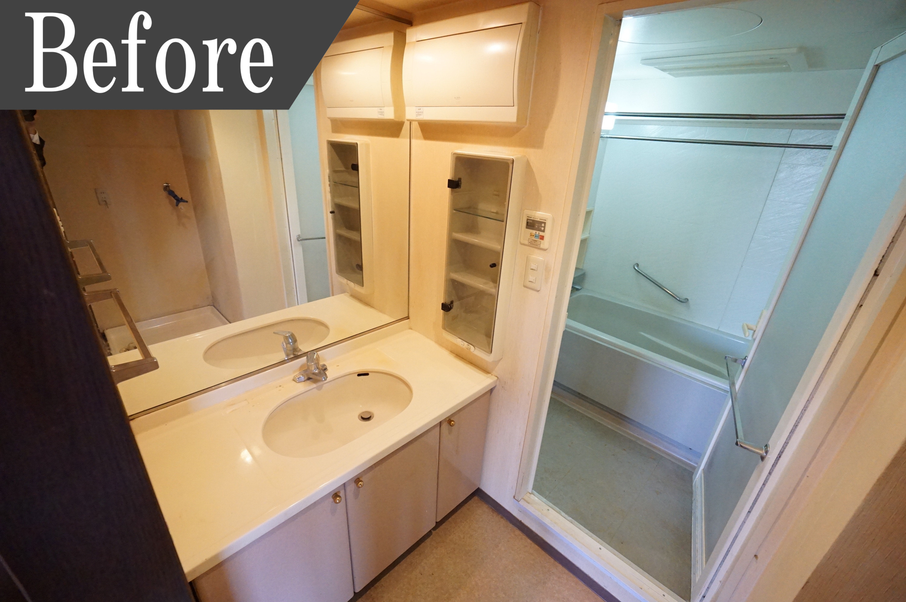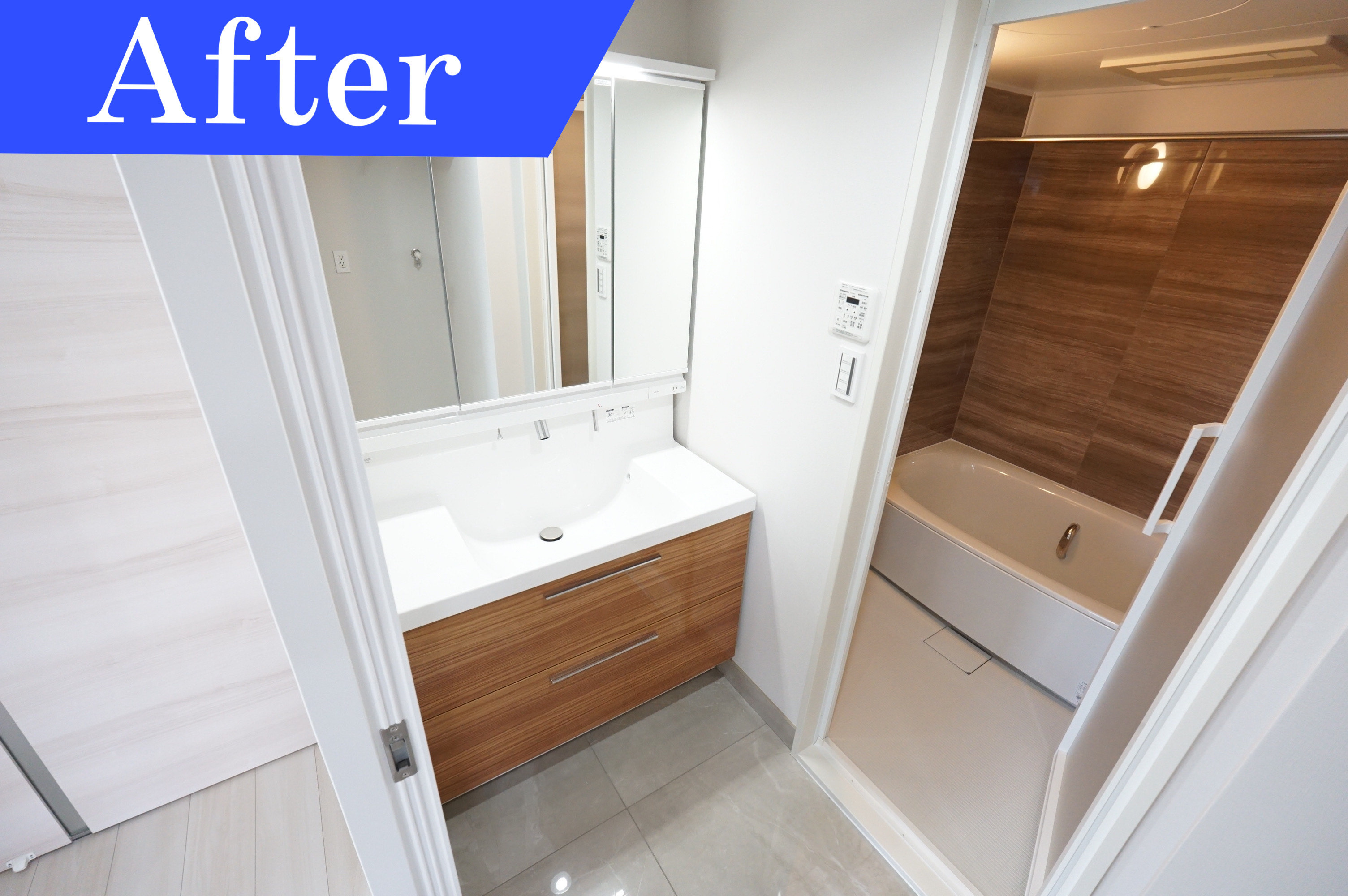 洗面台が広々としているのに洗面ボールが狭かった古い洗面化粧台は、洗面ボールの広さがある三面鏡化粧台に交換しました。三面鏡の裏には一面収納で収納スペースも広くなりました。洗面台下の収納は引き出しタイプなので収納がしやすいのが特徴です。温かな木目調のデザインがおしゃれです。壁、また床も張替え済みです。