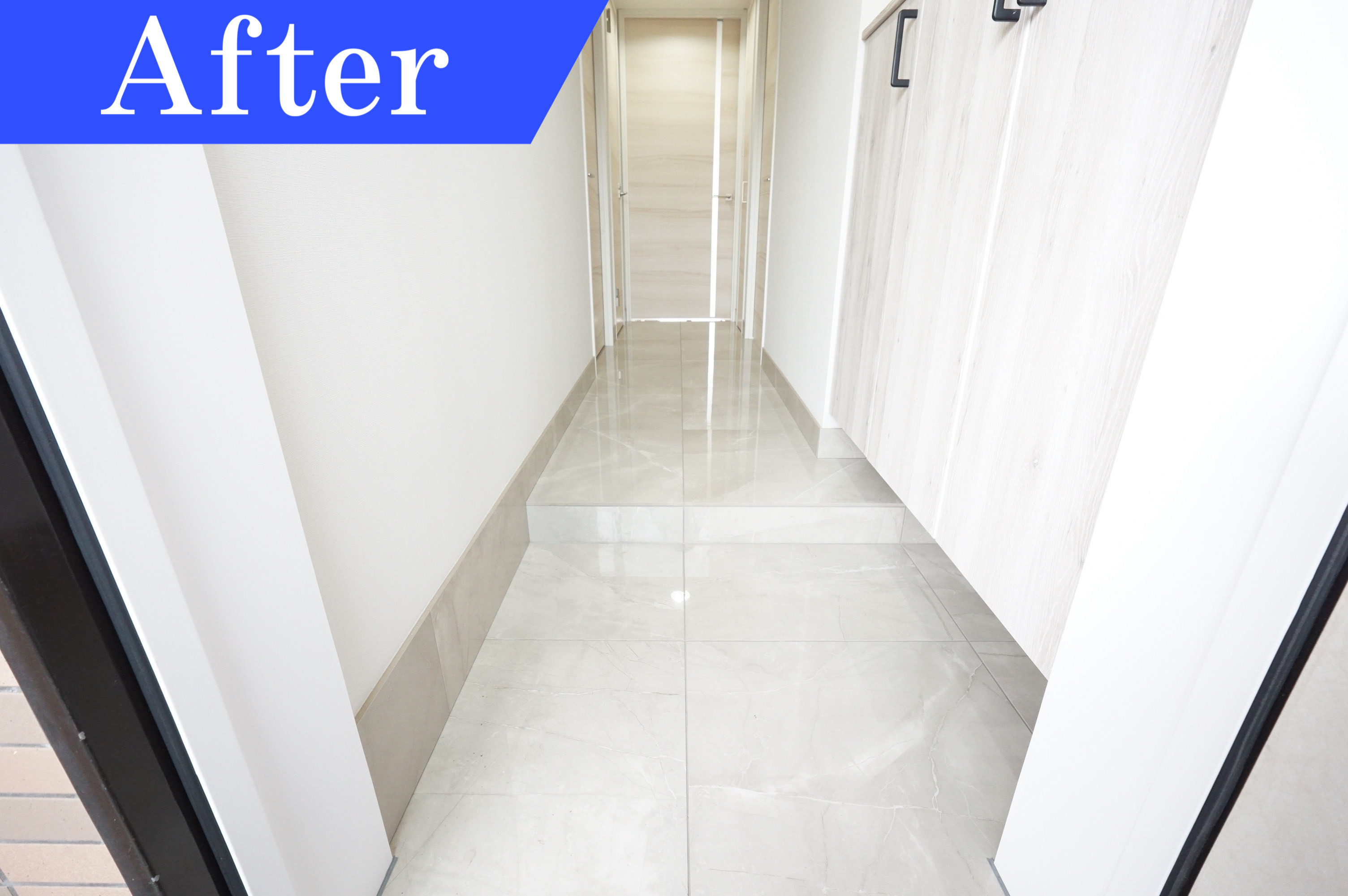 モダンな色合いの玄関は清潔感と高級感のあるデザインの玄関に仕上げました。玄関ドアを開けると明るく清潔な空間が広がっています。床は大理石のようなタイルを使用し、光沢感が洗練されたワンランク上のイメージを与えてくれます。収納は必要最低限に抑え、圧迫感のない高さにしました。玄関収納の上にはインテリアや小物も飾る事ができます。