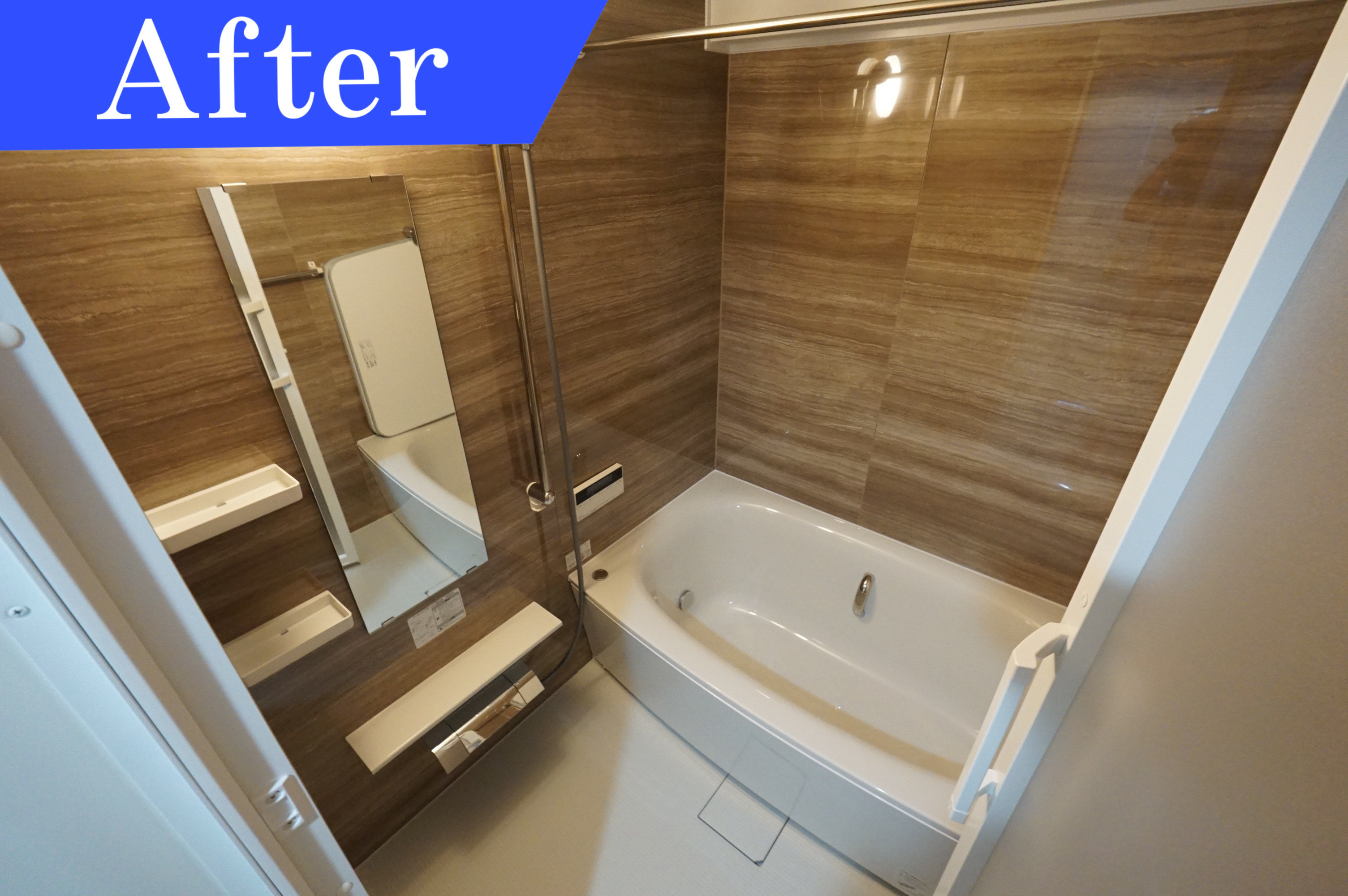 寒々しい浴室は温かみのある木目調のデザインを採用しました。