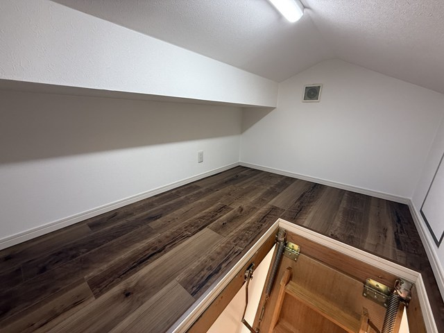 二階廊下の上には小屋裏収納が備わっています。小屋裏収納は床を上貼し、壁のクロスを張替えました。