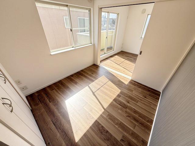 明るい陽ざしが注ぐ洋室。アクセントクロスで個性を出しながらも、落ち着きのある空間になっています。